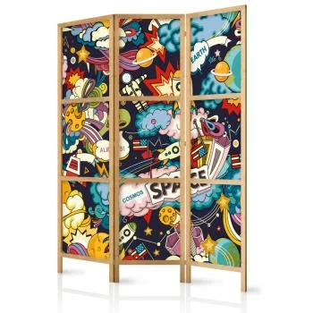 Parawan japoński - Galaktyczne zawody - Miś biorący udział w wyścigach samochodowych pośród planet - chmur i gwiazd w pastelowej kolorystyce