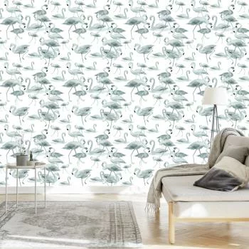 Tapeta Do Salonu Flamingi, Ptaki, Kwiaty, Zieleń