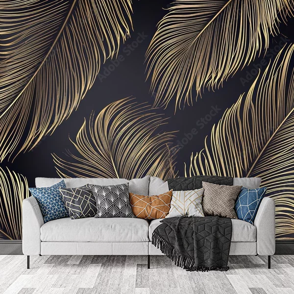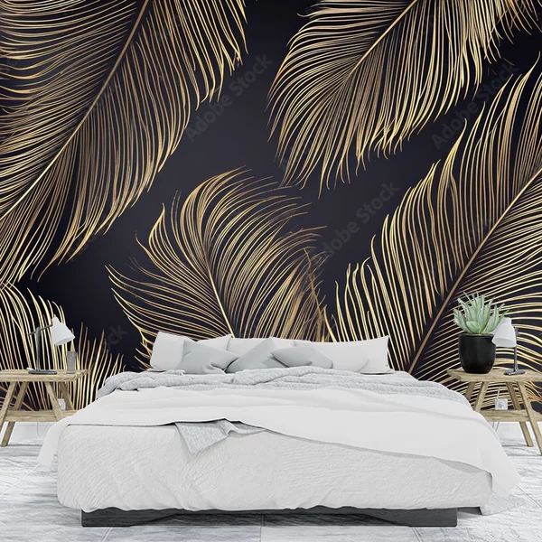 Na obrazie znajduje się wzór przedstawiający złote, dekoracyjne pióra na czarnym tle. Pióra są delikatnie zakrzywione, co dodaje całości wrażenie lekkości i elegancji. Idealnie nadaje się jako fototapeta na ścianę, wprowadzając luksusowy i stylowy akcent do wnętrza. Złote odcienie piór na ciemnym tle tworzą kontrast, który podkreśla ich szczegółowy design.