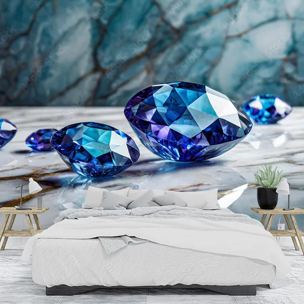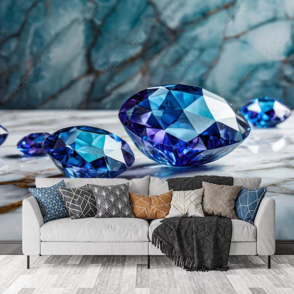 Na obrazie, który mógłby służyć jako fototapeta na ścianę, znajduje się kilka pięknie oszlifowanych niebieskich klejnotów, leżących na gładkiej, biało-niebieskiej, marmurowej powierzchni. Tło stanowi niebieska, marmurowa tekstura, która dodaje głębi i elegancji kompozycji. Blask klejnotów oraz ich doskonale oszlifowane krawędzie tworzą wrażenie luksusu i wyrafinowania. Całość obrazu ma elegancki, nowoczesny charakter i doskonale nadaje się do wnętrz, które mają emanująć prestiżem i klasą.