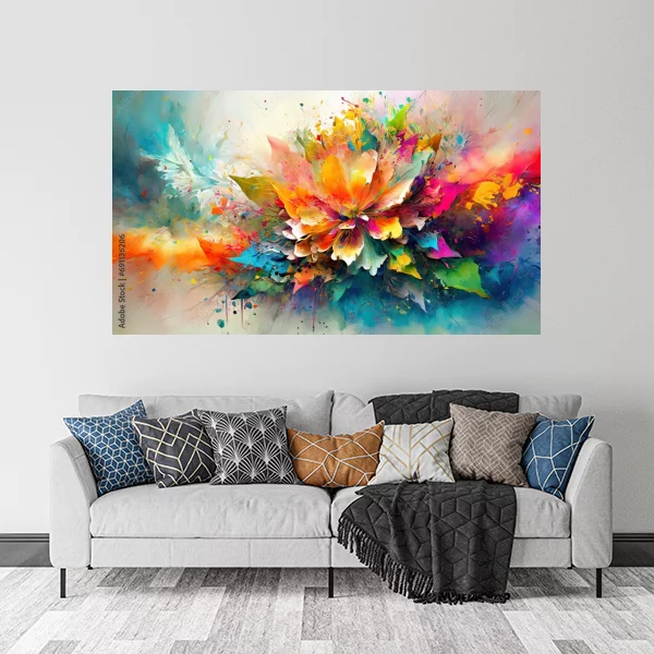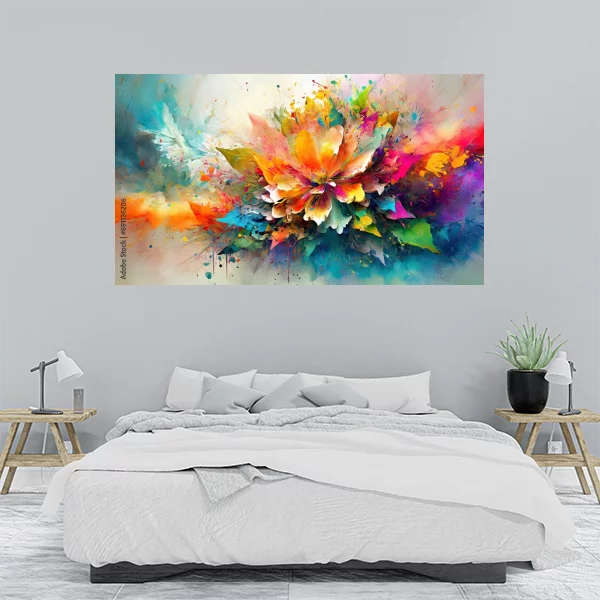 Obraz na płótnie przedstawia dynamiczną, kolorową abstrakcję. Centralnym elementem jest motyw przypominający eksplodujący kwiat, z płatkami w żywych odcieniach czerwieni, pomarańczu, żółci, zieleni, błękitu i fioletu. Kompozycja pełna jest energii i ruchu, a intensywne barwy przenikają się, tworząc wrażenie rozpryskującej się farby. Całość nadaje dziełu efekt lekkości i ekspresji, idealnie nadając się jako efektowna dekoracja ściany.