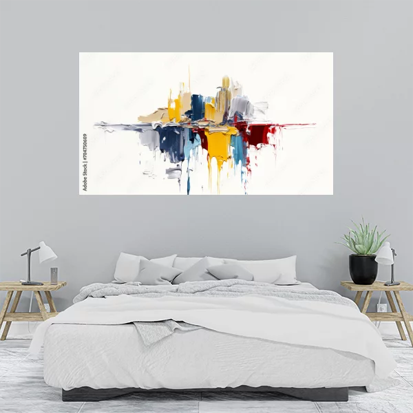 Opisany obraz na płótnie to abstrakcyjna kompozycja stworzona techniką malarstwa impasto. Znajdują się na nim intensywne, zróżnicowane kolory, takie jak żółty, niebieski, czerwony, biały i szary. Farba jest nałożona grubymi pociągnięciami pędzla, tworząc efekt trójwymiarowy, a jej fragmenty zdają się spływać w dół. Ta dynamiczna i ekspresyjna forma nadaje dziełu nowoczesny charakter, czyniąc je odpowiednim do współczesnego wnętrza.