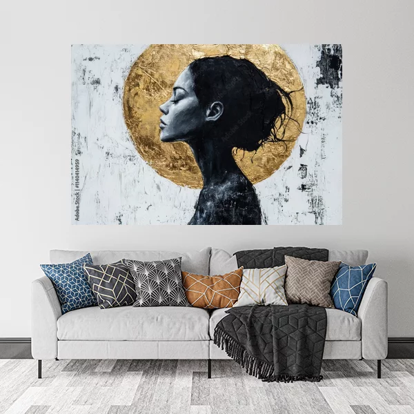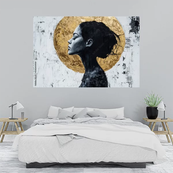 Obraz przedstawia subtelną sylwetkę kobiety z profilu, z akcentem na głębokie cienie i tajemniczą aurę. Tło zdobione jest złotym okręgiem, który dodaje kompozycji elegancji i głębi. Tego typu dzieło jest doskonałym wyborem do wnętrz, w szczególności do salonu czy sypialni, gdzie może wprowadzić atmosferę wyrafinowania i spokoju.