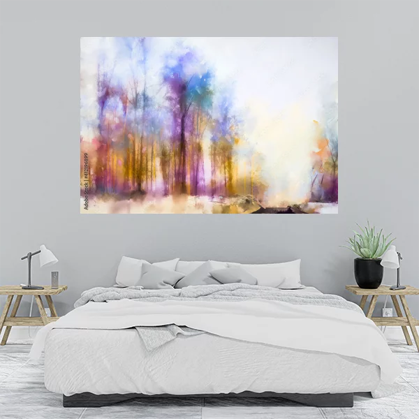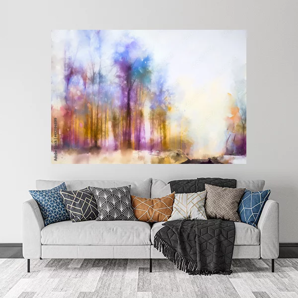 Obraz na płótnie przedstawia abstrakcyjny pejzaż lasu. Drzewa mają delikatne, zarysowane pnie i gałęzie, a całość utrzymana jest w pastelowej kolorystyce z dominującymi odcieniami fioletu, różu, niebieskiego i żółtego. Obraz ma lekko rozmyty, eteryczny charakter, co nadaje mu atmosfery spokoju i tajemnicy. Tło jest jasne, co podkreśla barwne korony drzew i tworzy efekt świetlistości.