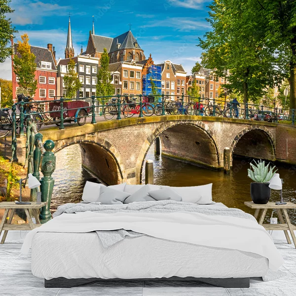 Fototapeta przedstawia malowniczy widok na most i kanał w Amsterdamie. Na pierwszym planie widnieje zabytkowy, łukowy most, na którym ustawione są zaparkowane rowery, co jest charakterystyczne dla tego miasta. Most przechodzi nad brązowymi wodami kanału. W tle widać tradycyjne amsterdamskie kamienice z wysokimi, wąskimi fasadami oraz szpiczaste wieże kościoła. Otoczenie jest zielone, z drzewami rosnącymi po obu stronach kanału, co dodaje kompozycji uroku i naturalności. Pogodne niebo i jasne światło sugerują słoneczny dzień, dając wrażenie ciepła i spokoju. Taka fototapeta idealnie nadaje się do wnętrz, które potrzebują odrobiny europejskiego klimatu i zachęcającej atmosfery.