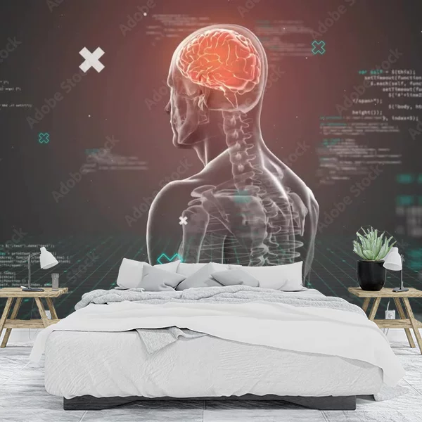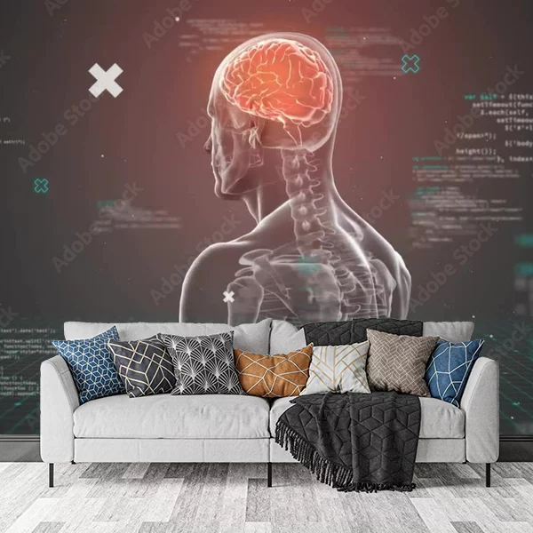 Produkt fototapety na ścianę przedstawia zaawansowaną technicznie ilustrację anatomiczną człowieka. Widać sylwetkę ludzką z prześwitującą skórą, ukazującą wewnętrzne struktury, takie jak kręgosłup oraz mózg, które są wyróżnione. Wokół postaci znajdują się różne cyfry, teksty i wykresy, nadawane w stylu kodu komputerowego, co dodaje nowoczesnego, technologicznego akcentu. Kolory dominujące to odcienie szarości, przełamywane przez czerwony kolor mózgu oraz zielona siatka cyfrowa na podłodze. Taka fototapeta idealnie sprawdzi się w nowoczesnych biurach, laboratoriach czy miejscach związanych z medycyną oraz technologią.