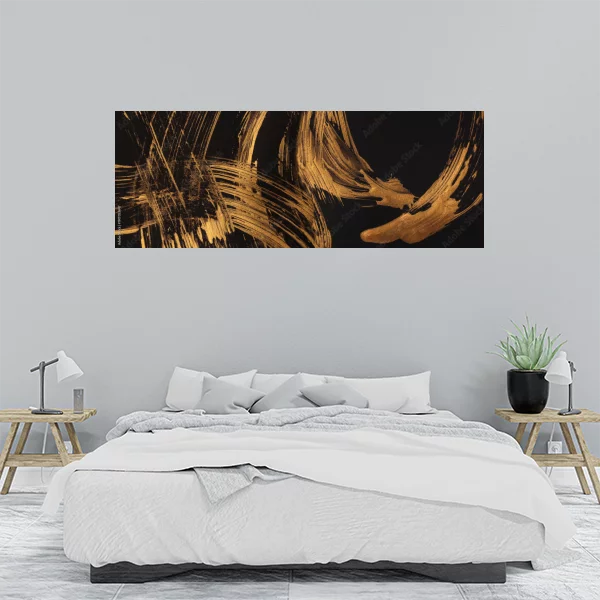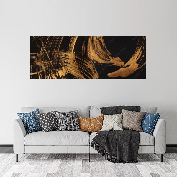 Obraz przedstawia abstrakcyjną kompozycję na ciemnym tle. Wykorzystano złote pociągnięcia pędzlem, które tworzą dynamiczne, krzywe linie i smugi. Układ linii jest żywiołowy i spontaniczny, co dodaje dziełu energii. Złoty kolor kontrastuje z ciemnym tłem, co tworzy efekt elegancji i głębi. Taki obraz może być interesującym dodatkiem dekoracyjnym, dodając wyrafinowanego akcentu do wnętrza.