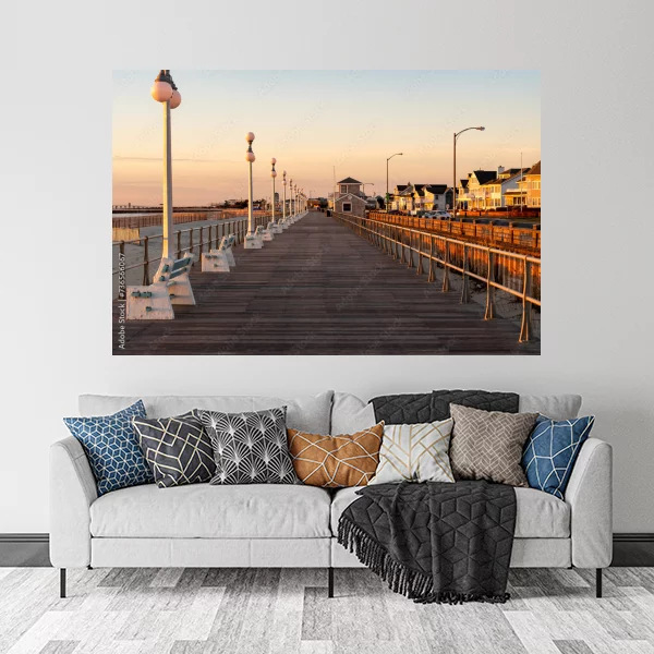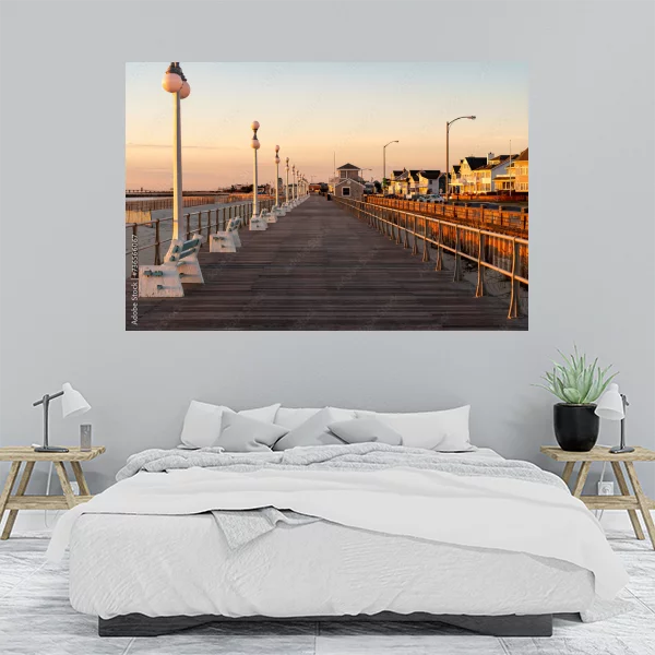 Obrazek przedstawia malowniczy nadmorski deptak oświetlony ciepłym światłem zachodzącego słońca. Długie, drewniane molo prowadzi w głąb, jednocześnie z jednej strony granicząc z plażą, a z drugiej z szeregiem urokliwych domków w stylu nadmorskim. Całość tworzy spokojną i relaksującą atmosferę, idealną do wnętrz, zarówno do salonu, jak i do sypialni, przywołując wspomnienia wakacji i beztroskich chwil nad morzem.