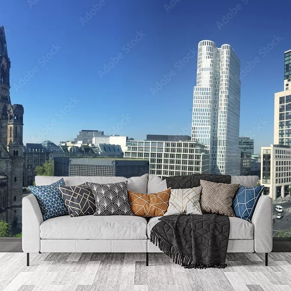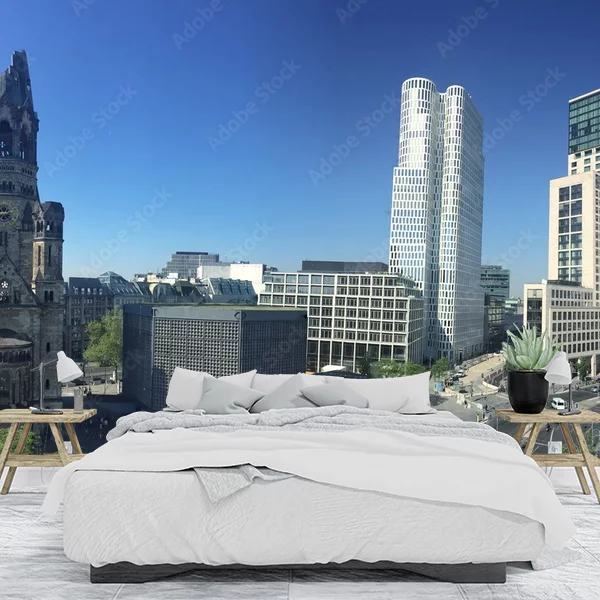 Całość kompozycji jest utrzymana w słonecznym, bezchmurnym dniu, z wyraźnym błękitnym niebem w tle. Na ulicach i placach można dostrzec ludzi oraz samochody, co dodaje życie całemu pejzażowi. Fototapeta z taką miejską sceną stałaby się doskonałym akcentem dekoracyjnym, przynoszącym poczucie wyjątkowej dynamiki i kontrastu między historią a nowoczesnością do każdego pomieszczenia.