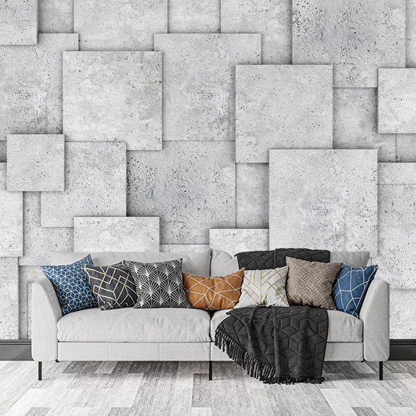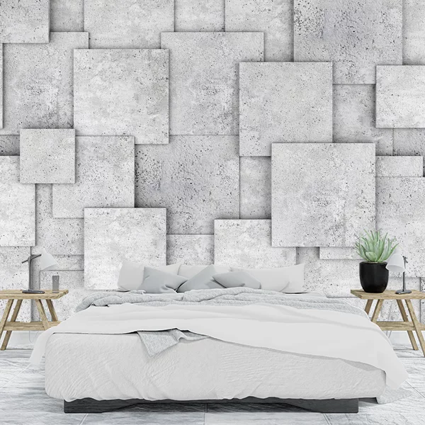 Szara fototapeta przedstawia abstrakcyjną kompozycję składającą się z wielu nakładających się na siebie kwadratów. Każdy kwadrat ma delikatne odcienie szarości, co nadaje całości minimalistyczny i nowoczesny charakter. Tekstura kwadratów przypomina betonowe powierzchnie, co dodaje surowości i industrialnego klimatu.