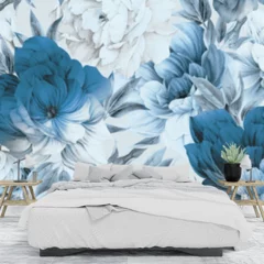 Fototapeta przedstawia kompozycję dużych kwiatów w tonacji niebiesko-białej. Kwiaty są pełne, przypominające peonie lub róże, z delikatnymi cieniowaniami. Liście i inne elementy roślinne otaczają kwiaty, tworząc harmonijną i spokojną całość. Kolorystyka jest stonowana, co nadaje obrazowi elegancji i subtelności. Idealny na ścianę jako dekoracyjny element wnętrza.
