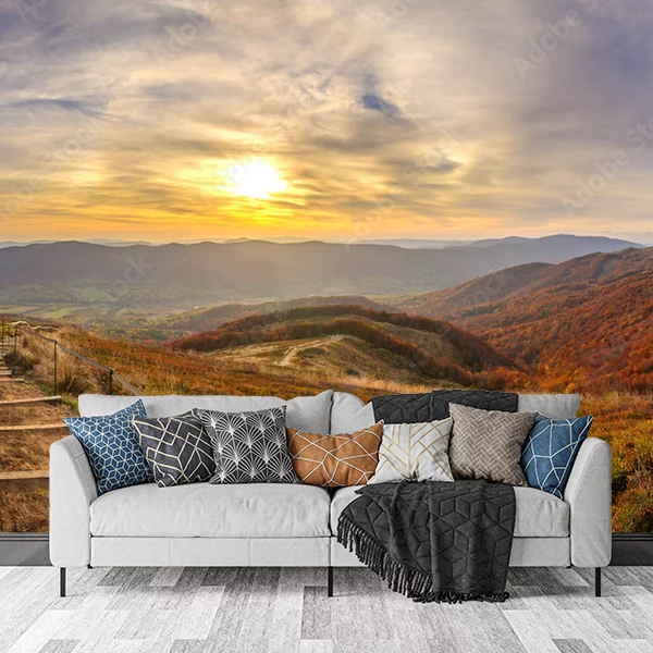 To, co widzimy na obrazie, to malowniczy widok na górski krajobraz podczas zachodu słońca. Fototapeta przedstawia ścieżkę prowadzącą przez wzgórza, otoczoną poręczami z drewnianymi słupkami i linami. Ścieżka schodzi w dół, a wokół niej rozpościera się bujna roślinność w odcieniach jesiennych brązów, pomarańczy i zieleni. Na dalszym planie widać rozległe doliny i kolejne pasma górskie, które stopniowo zanikają w oddali. Na horyzoncie słońce jest nisko nad górami, oświetlając niebo ciepłymi kolorami żółci, pomarańczy i różu, mieszającymi się z chłodniejszymi odcieniami błękitu. Cała scena emanuje spokojem i naturalnym pięknem, idealnie nadając się na fototapetę, która może wprowadzić do wnętrza poczucie przestrzeni i bliskości z naturą.