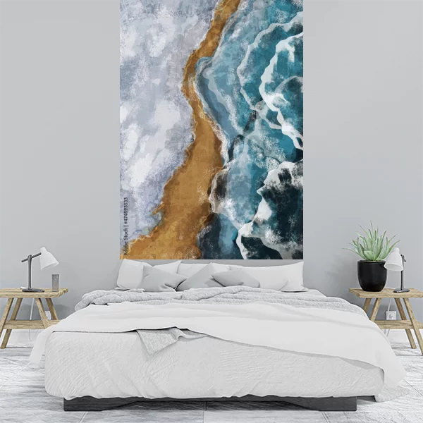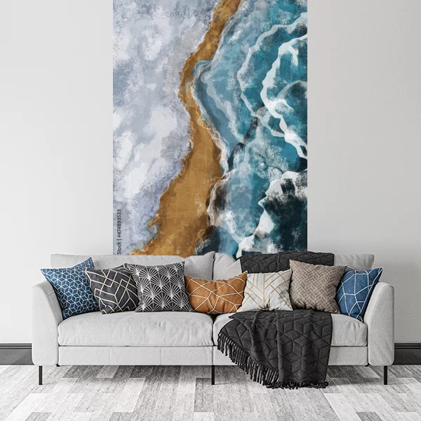 Z prawej strony obraz przechodzi w chłodne, niebieskie tony, które przypominają fale oceanu. Niebieskie obszary mają delikatnie zarysowane krawędzie, co nadaje im organiczny wygląd przypominający morską bryzę lub szorstką powierzchnię skały. Cała kompozycja jest nieco impresjonistyczna i zachęca do własnej interpretacji, pozwalając widzowi na odnalezienie własnego znaczenia w tej abstrakcyjnej scenerii.