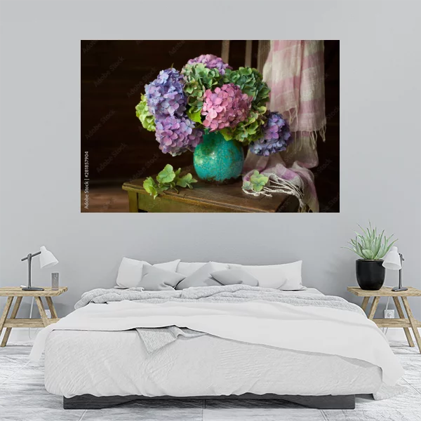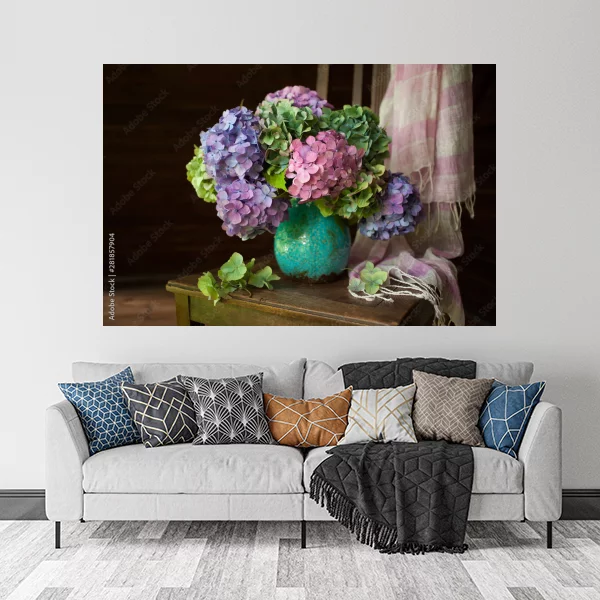 Ten obrazek przedstawia piękny bukiet hortensji w pastelowych odcieniach różu, fioletu i zieleni, umieszczony w turkusowym wazonie. Ułożony na drewnianym stoliku, ten kompozycyjny element nadaje wnętrzu elegancji i świeżości. Miękka tkanina w delikatne pasy dodaje całości ciepła i przytulności.