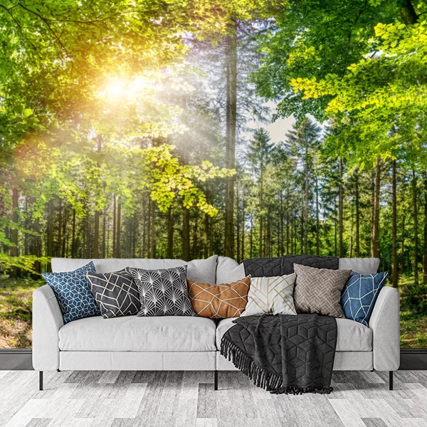 Ta fototapeta przedstawia malowniczy las w słoneczny dzień. Promienie słońca przenikają przez korony drzew, tworząc niezwykły efekt świetlny i podkreślając bujną zieleń liści. W tle widać wąską ścieżkę wijącą się między drzewami, co daje poczucie głębi i zaprasza widza do eksploracji. Taka fototapeta nadaje się do tworzenia spokojnej, naturalnej atmosfery w pomieszczeniu, idealnie pasując do przestrzeni, które chcą odzwierciedlać harmonię z naturą.
