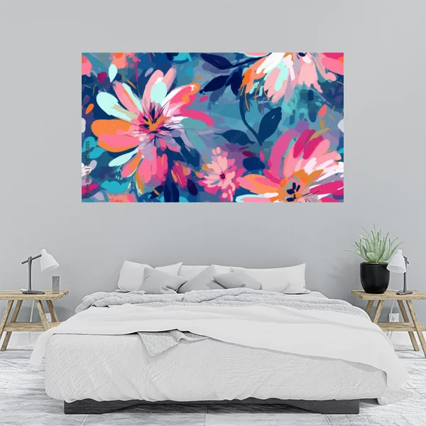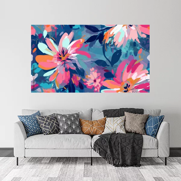 Ten żywy i kolorowy obrazek przedstawia abstrakcyjną kompozycję kwiatową, która doskonale nadaje się do wnętrz w nowoczesnym stylu. Idealny jako obraz drukowany na płótnie na ścianę, wprowadza do salonu lub sypialni artystyczną elegancję i świeżość. Wykonany na zamówienie, dostępny na wielu materiałach, takich jak szkło plexi, płyta PCV, płótno bawełniane czy poliestrowe. Oryginalność tego projektu podkreślają intensywne odcienie różu, niebieskiego i pomarańczowego, które przyciągają wzrok i ożywiają przestrzeń.