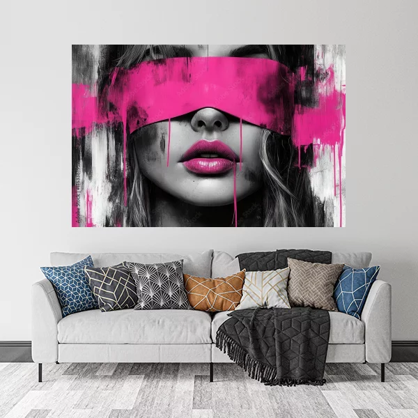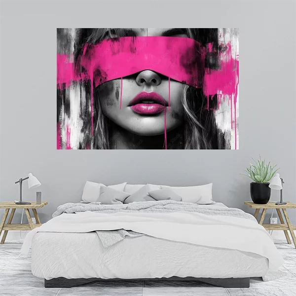 Obrazek przedstawia portret kobiety z różową opaską na oczach, co dodaje tajemniczości i nowoczesnego stylu. To dzieło sztuki jest idealnym wyborem do wnętrz, szczególnie do salonu lub sypialni, gdzie stanie się centralnym punktem dekoracyjnym. Obraz ten jest dostępny na wymiar, co pozwala dopasować go idealnie do przestrzeni, którą chce się urządzić.