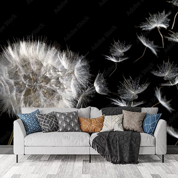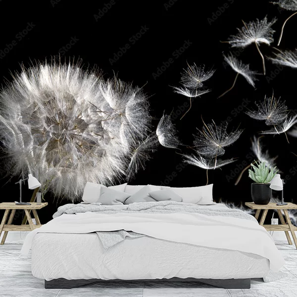 Ten obraz przedstawia zbliżenie dmuchawca z białymi piórkowatymi nasionami na ciemnym tle. Dmuchawiec jest widoczny po lewej stronie, a jego nasiona unoszą się swobodnie w powietrzu po prawej stronie. Delikatne detale białych nasion kontrastują z ciemnym tłem, co nadaje obrazowi efekt lekkości i ruchu. Fototapeta z takim motywem może dodać wnętrzu subtelnego naturalnego uroku i wrażenia spokoju. Idealnie sprawdzi się w salonie, sypialni czy przestrzeni biurowej, wprowadzając element przyrody do wnętrza.