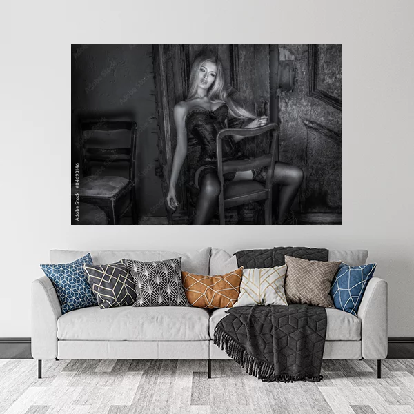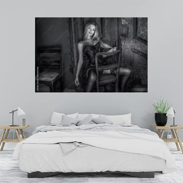 The dim lighting enhances the mood, casting subtle shadows and highlighting the contours of the subject. Two additional chairs in the foreground and background add depth to the scene, suggesting a narrative yet to be uncovered. This artwork is ideal for adding a touch of vintage allure to any space, inviting viewers to ponder the stories behind the captured moment. Its timeless aesthetic and intriguing ambiance make it a captivating centerpiece for any wall.