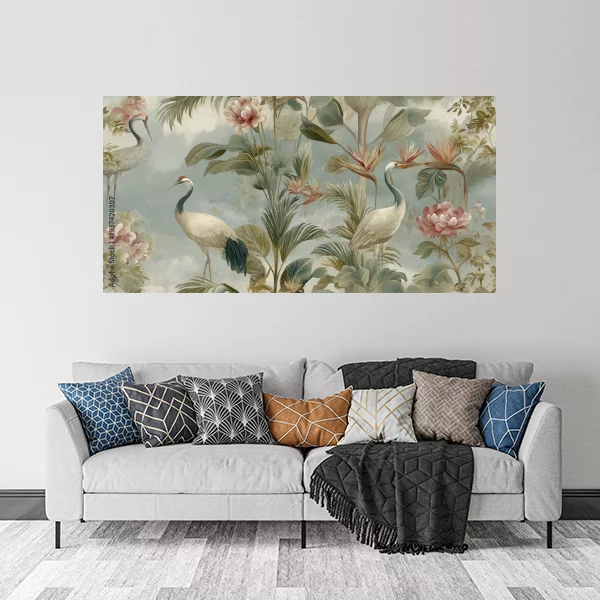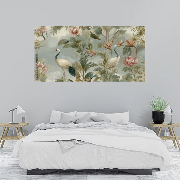 Obrazek przedstawia piękną, stylizowaną scenę z natury, gdzie dominują delikatne barwy i subtelne detale. Obecność egzotycznych ptaków i bogatej roślinności tworzy atmosferę spokoju i harmonii, idealnie pasującą do wnętrz takich jak salon czy sypialnia. Motyw ten jest doskonałym uzupełnieniem wystroju wnętrz, dodając im elegancji i stylu.