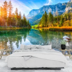 Na fototapecie znajdują się zachwycające krajobrazy przyrodnicze, idealne do wzbogacenia wnętrza. Widok przedstawia spokojne jezioro otoczone bujną roślinnością. W tle widoczne są majestatyczne góry, częściowo pokryte lasem, które tworzą zapierający dech w piersiach pejzaż. Woda jeziora jest tak krystalicznie czysta, że odbija otaczające drzewa i niebo. Na pierwszym planie widać kilka kamieni zanurzonych w płytkiej wodzie, podkreślając naturalny urok miejsca. Całość kompozycji jest skąpana w ciepłym świetle zachodzącego słońca, co dodaje uroku i spokoju tej malowniczej scenie. Idealne do wzbogacenia wnętrza i stworzenia relaksującej atmosfery.
