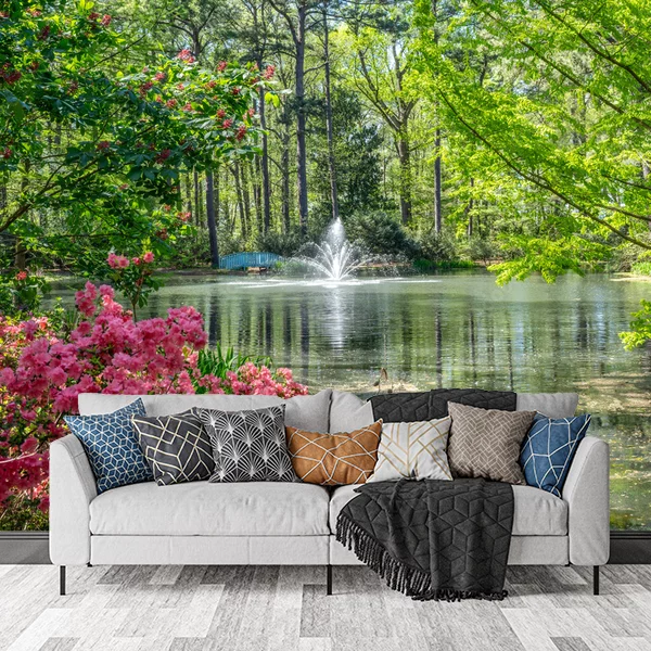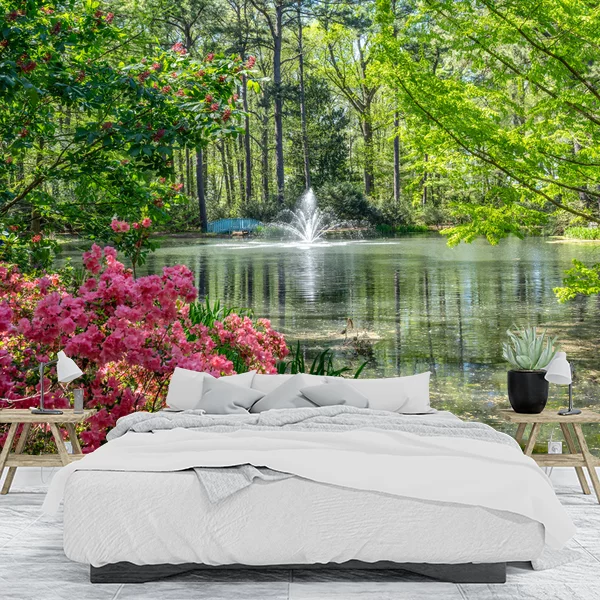 Fototapeta przedstawia malowniczy pejzaż ogrodowy. Na pierwszym planie widać obfite krzewy różowych kwiatów, które kontrastują z zielenią otoczenia. W tle znajduje się spokojne jezioro, z centralnie umieszczoną fontanną, której woda tworzy delikatne wzory na powierzchni. Wokół jeziora rosną liczne drzewa, przez które przenikają promienie słońca, co nadaje całej scenerii jasności i świeżości. To obraz pełen spokoju i harmonii, idealny do wprowadzenia naturalnego piękna do wnętrza.