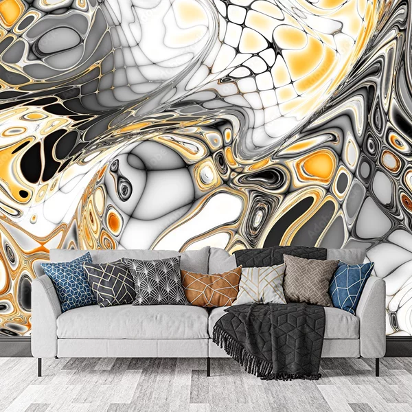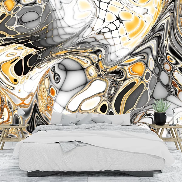 Na obrazie widoczna jest abstrakcyjna kompozycja o dynamicznych, wirujących kształtach. Dominują w niej kolory czarny, biały, szary i żółty, tworzące intrygujące i złożone wzory. Przypomina to mozaikę lub efekt płynnego szkła, pełną zaokrąglonych form i nieregularnych linii. Taki wzorzysty motyw nadawałby się idealnie na fototapetę na ścianę, dodając wnętrzu nowoczesnego i awangardowego charakteru. Jest to doskonały wybór dla osób ceniących sobie unikalność i styl w aranżacji przestrzeni.