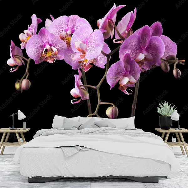 Fototapeta przedstawia delikatne, różowe orchidee na tle głębokiej czerni, co podkreśla ich piękno i finezję. Kwiaty wydają się trójwymiarowe, dzięki czemu obraz nabiera głębi i elegancji. Subtelne odcienie różu oraz zielone łodyżki dodają kompozycji lekkości. Taka fototapeta doda wnętrzu klasy, spokoju i naturalnego uroku, czyniąc przestrzeń bardziej przytulną i stylową. Idealna do salonu, sypialni lub przestrzeni relaksacyjnej.
