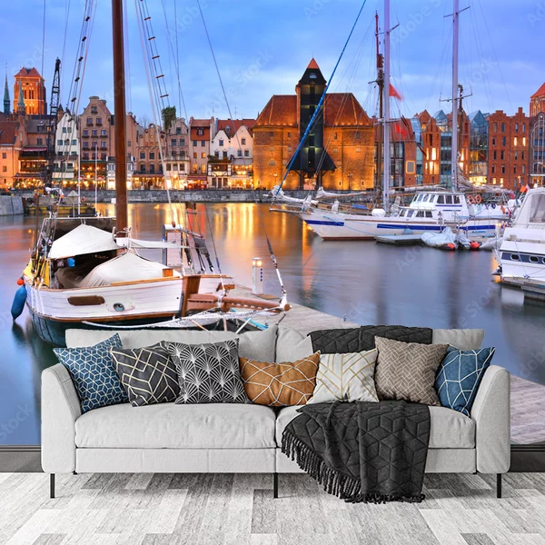Na obrazie przedstawiona jest przystań z łodziami w godzinach wieczornych lub nocnych. W tle widać malowniczą zabudowę miasta z historycznymi budynkami, które są efektownie oświetlone, tworząc ciepłą, przytulną atmosferę. Refleksy świateł odbijają się w spokojnej wodzie portowej, a cumujące jachty dodają scenie elegancji i spokoju. Na pierwszym planie można dostrzec dużą żaglówkę przycumowaną przy nabrzeżu, a w tle widać wieżyczki oraz zabytkowe budowle. To idealny motyw na obraz lub fototapetę na ścianę, który wprowadzi do wnętrza spokój i urok nadmorskiego miasta.