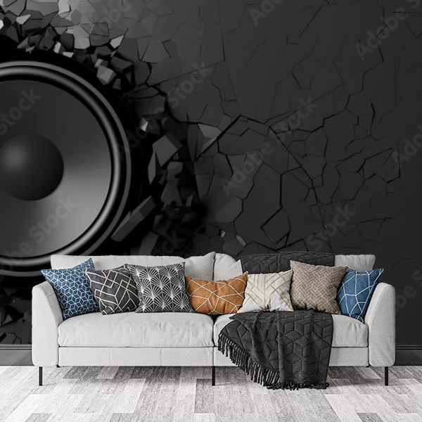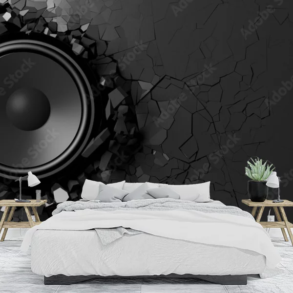 Fototapeta przedstawia duży głośnik, który wydaje się przebijać przez powierzchnię ściany. Tło jest ciemne, przebite, jakby rozbite kawałki materiału były wyrzucane w różne strony wokół głośnika. Całość utrzymana jest w odcieniach czerni i szarości, co nadaje obrazowi dynamiczny i nowoczesny wygląd, idealny do wnętrz o technicznej lub industrialnej stylistyce.