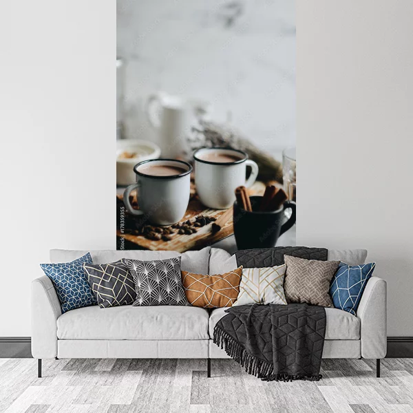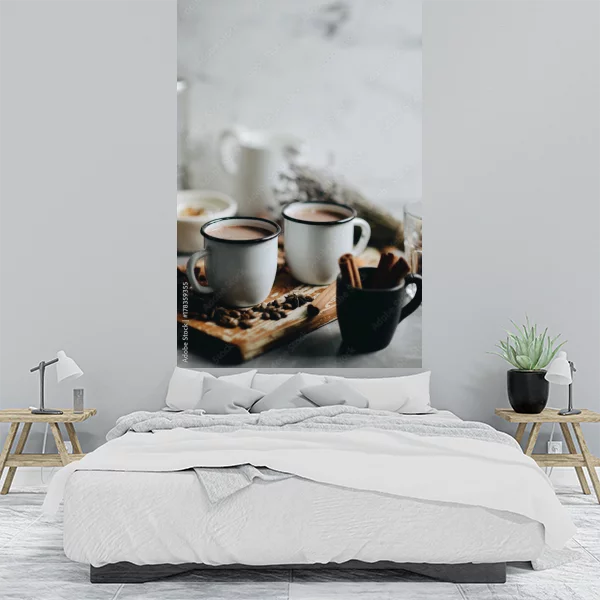 Ten obraz przedstawia przytulną, rustykalną scenę ze świeżo zaparzonym napojem. Na pierwszym planie widzimy drewnianą tacę z dwoma białymi kubkami wypełnionymi gorącym napojem, prawdopodobnie kawą lub czekoladą. Obok kubków znajdują się rozrzucone ziarna kawy, dodając kompozycji charakteru. Po prawej stronie na pierwszym planie widzimy ciemny kubek wypełniony laskami cynamonu, co obu napojom nadaje dodatkowego klimatu przytulności. W tle możemy dostrzec elementy, które sugerują kuchenne otoczenie, takie jak dzbanek na mleko. Całość ma stonowaną, naturalną kolorystykę z dominującymi odcieniami bieli, brązu i beżu, co sprawia, że obraz będzie doskonale pasował do wnętrz utrzymanych w stylu rustykalnym lub skandynawskim.