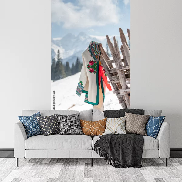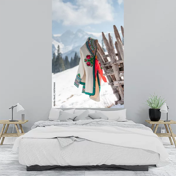 Obraz na płótnie przedstawia malowniczy krajobraz górski, idealny do wnętrz w stylu rustykalnym lub nowoczesnym. Na pierwszym planie widać drewniane ogrodzenie, na którym zawieszono tradycyjny, haftowany materiał z wzorem kwiatowym, dodający całości ciepła i przytulności. Tło komponuje się z ośnieżonymi szczytami gór, osnutymi delikatną mgiełką, co tworzy atmosferę spokoju i harmonii. Ten artystyczny obraz jest doskonałym wyborem do salonu lub sypialni, wprowadzając do wnętrza odrobinę natury i tradycyjnej estetyki.