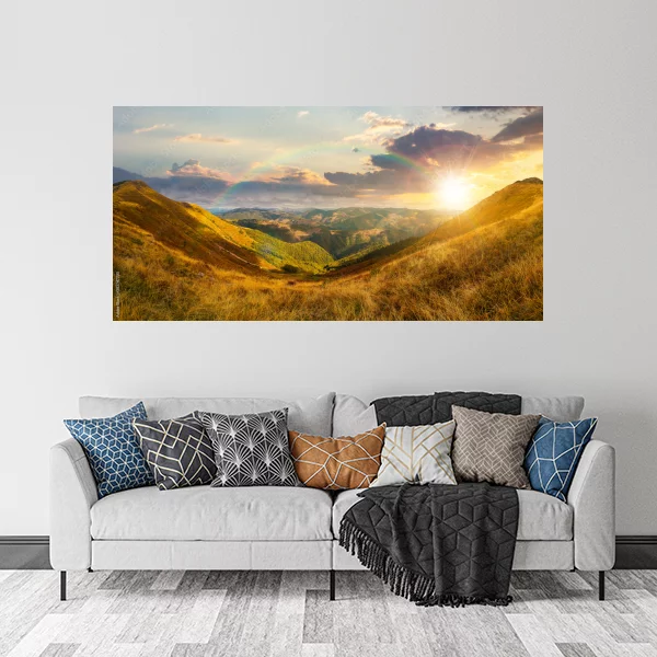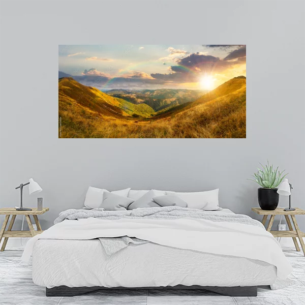 Opisany obrazek przedstawia malowniczy krajobraz górski o zachodzie słońca. Ciepłe, złociste światło słońca oświetla zbocza gór, na których spoczywa tęcza. Widok ten idealnie nadaje się jako dekoracja do wnętrza, wprowadzając do niego barwy i atmosferę naturalnego spokoju. Takie dzieło sztuki jest doskonałe do salonu, nadając mu charakter przytulności i elegancji, ale równocześnie świetnie sprawdzi się w sypialni, gdzie stworzy harmonijną atmosferę sprzyjającą relaksowi.