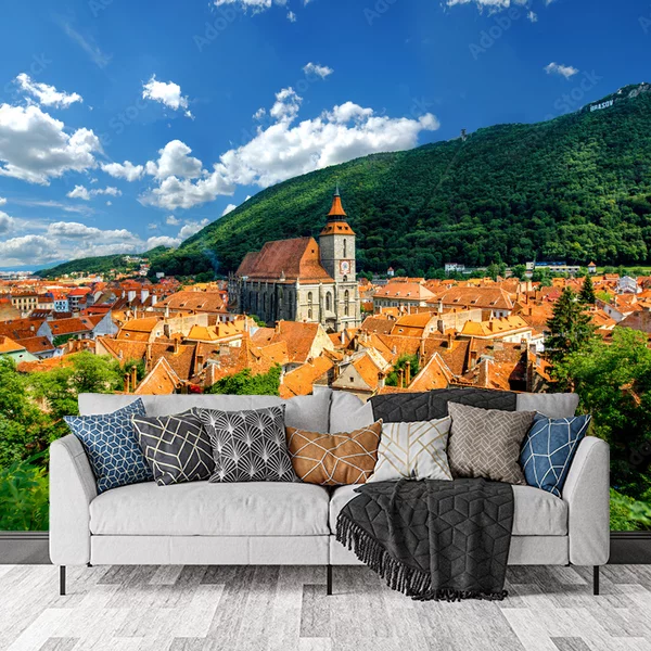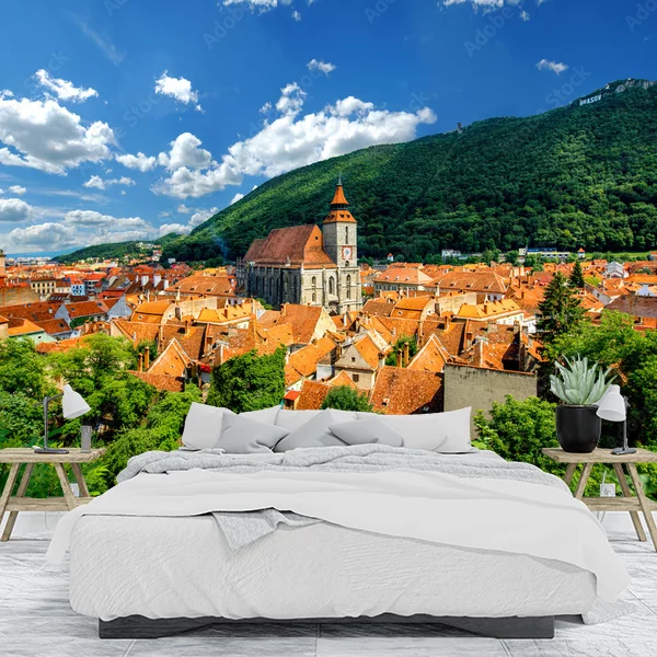 Fototapeta przedstawia urokliwy widok na średniowieczne miasto z zabytkową architekturą, charakterystycznymi czerwonymi dachami i imponującą katedrą w centrum. W tle rozciąga się malowniczy, zalesiony wzgórz, tworzący kontrast z błękitnym niebem i białymi chmurami. Przyroda w harmonijny sposób otacza miasto, dodając mu spokoju i uroku. To idealne tło do stworzenia atmosfery ciepła, nostalgii i elegancji w każdym wnętrzu.