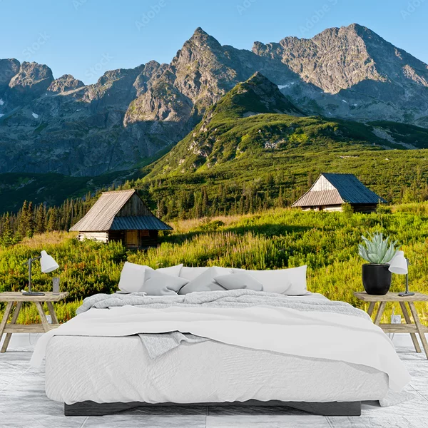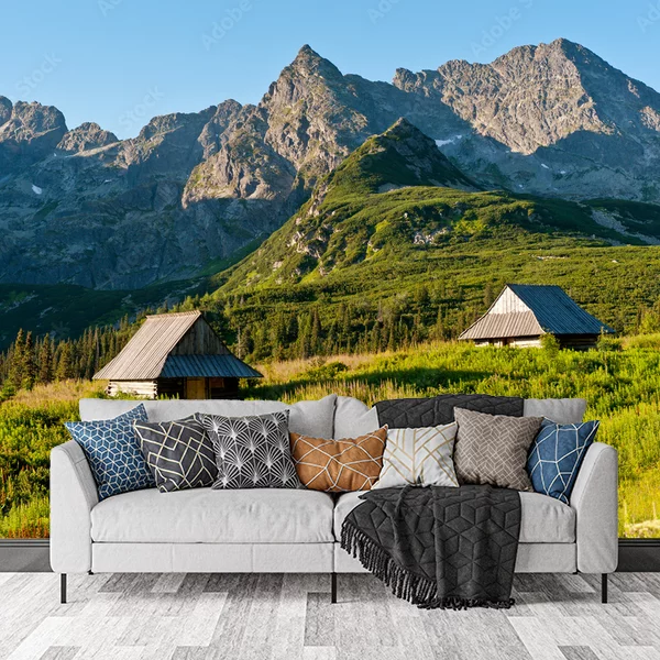 Oferowany produkt to fototapeta ścienna prezentująca malowniczy górski krajobraz. Na obrazie znajdują się majestatyczne szczyty górskie, otoczone bujną zielenią i wysokimi krzewami. W dolnej części fotografii widać urokliwe, drewniane chaty, które dodają scenerii rustykalnego uroku. Słoneczne światło dodaje ciepła i podkreśla naturalne piękno tego krajobrazu, tworząc przytulny i relaksujący nastrój. Taka fototapeta to idealne rozwiązanie dla miłośników natury i gór, którzy chcą wnieść odrobinę świeżości i spokoju do swojego wnętrza.