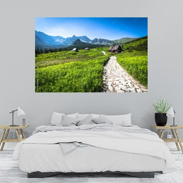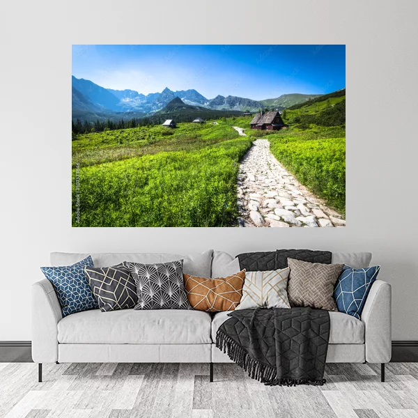 Oto obraz przedstawiający urokliwy górski krajobraz, który doskonale wpasuje się w każdą przestrzeń, zarówno w salonie, jak i sypialni. Ścieżka prowadząca przez zielony krajobraz, z malowniczymi chatkami i majestatycznymi górami w tle, przyciąga wzrok i wprowadza do wnętrz uczucie spokoju oraz bliskości natury. Drukowany na płótnie na wymiar, obraz ten można zamówić także na innych materiałach, takich jak szkło plexi, płyta PCV, płótno bawełniane i poliestrowe, czy na korku. Dla dodatkowego efektu, dostępny jest również w eleganckiej ramie drewnianej w kolorze czarnym lub naturalnym. Możliwość druku na płycie dibond gwarantuje nowoczesny wygląd i trwałość. Ten obraz stanowi idealne uzupełnienie wystroju, dodając elegancji i charakteru każdemu wnętrzu.