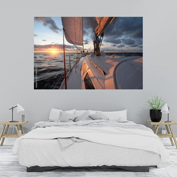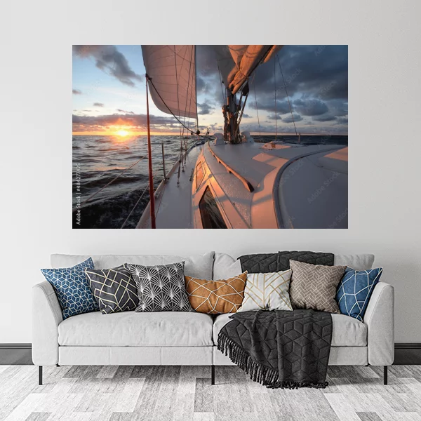 Obrazek przedstawia dynamiczny widok na żaglowiec pływający po spokojnym morzu, z malowniczym zachodem słońca w tle. Idealnie nadaje się jako dekoracja do wnętrz, wprowadzając atmosferę spokoju i przygody. Doskonale sprawdzi się zarówno w salonie, jak i w sypialni, dodając im unikalnego charakteru i elegancji.