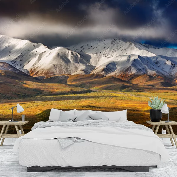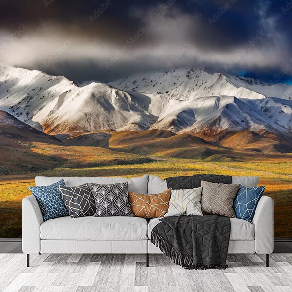 Fototapeta przedstawia malowniczy górski krajobraz pokryty śniegiem. Na pierwszy plan wysuwają się majestatyczne szczyty górskie, ośnieżone i kontrastujące z ciemnymi chmurami na niebie. Poniżej rozciąga się kolorowa dolina, oświetlona promieniami słońca, z przebijającymi się odcieniami zieleni i złota. Całość tworzy dynamiczny i urzekający widok, który wnosi do wnętrza poczucie przestrzeni i natury. Idealnie nadaje się na fototapetę, dodając uroku każdemu pomieszczeniu.