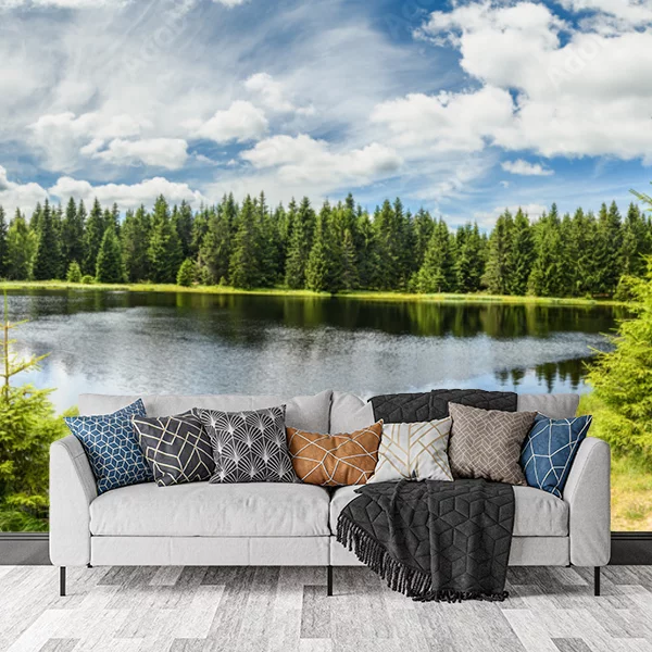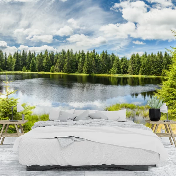 Ta fototapeta przedstawia malowniczy krajobraz leśny z urokliwym jeziorem. Na pierwszym planie widoczna jest spokojna tafla wody, w której odbijają się chmury i otaczające ją drzewa iglaste. Wzdłuż prawej strony biegnie wąska, kamienista ścieżka prowadząca w głąb lasu. W tle, gęsty las iglasty tworzy zieloną granicę, kontrastując z błękitnym niebem usianym białymi chmurami. Taka fototapeta wprowadzi do wnętrza atmosferę spokoju i bliskości natury, idealnie nadając się do salonu, biura lub sypialni.
