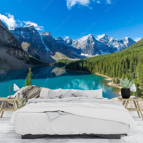Ta fototapeta przedstawia zapierający dech w piersiach krajobraz z widokiem na skaliste góry otaczające turkusowe jezioro. Woda jeziora jest krystalicznie czysta, odbijając majestatyczne szczyty górskie pokryte śniegiem. Otoczenie wypełniają gęste lasy iglaste, które nadają obrazowi harmonii i spokoju. Całość skąpana jest w jasnym świetle naturalnego dnia, z błękitnym, bezchmurnym niebem, co wprowadza do pomieszczenia atmosferę świeżości i wolności. Idealna opcja na ścianę, by dodać przestrzeni głębi i naturalnego piękna.