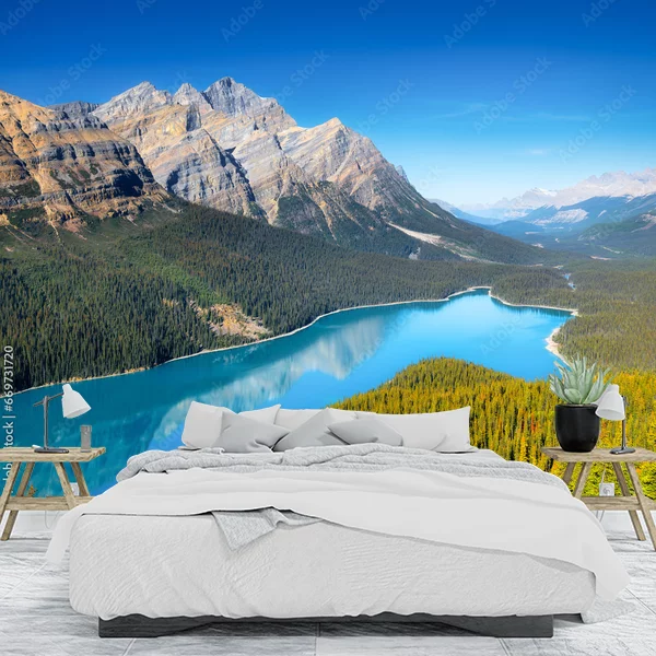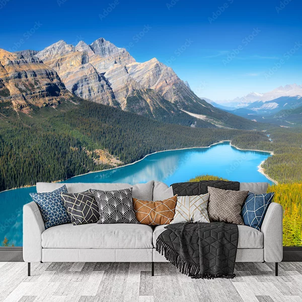 Fototapeta przedstawia majestatyczny krajobraz z wysokimi, skalistymi górami w tle. Na pierwszym planie znajduje się lśniące, turkusowe jezioro otoczone gęstym, zielonym lasem iglastym. Głębia kolorów i naturalne piękno tego widoku tworzą atmosferę spokoju i harmonii. Klarowne, błękitne niebo nad górami dodaje całości uczucia przestrzenności i świeżości. Jest to doskonały wybór na ścianę, aby przynieść do wnętrza wrażenie otwartej przestrzeni i natury.