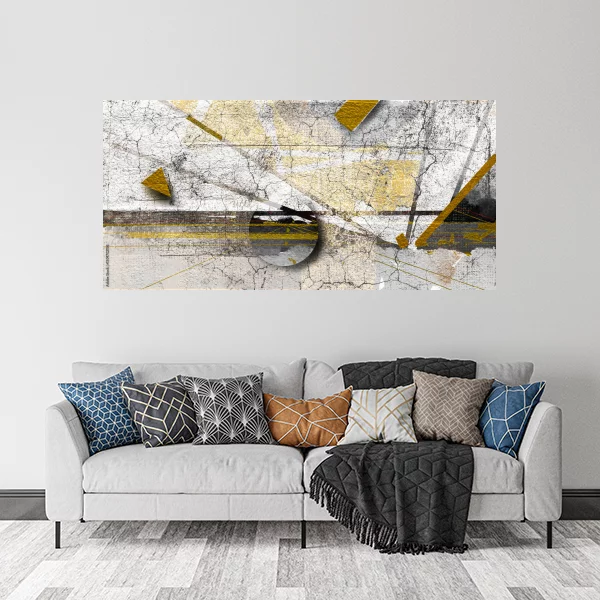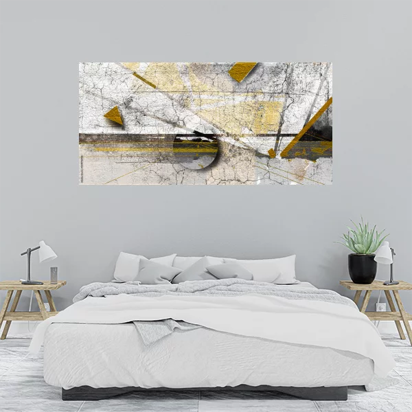 Powierzchnia przypomina popękany tynk lub strukturę betonu, co nadaje dziełu teksturalnej głębi. Złote elementy dodają elegancji, podczas gdy ciemniejsze linie wprowadzają kontrast i dynamikę. Całość sprawia wrażenie zderzenia różnych form i faktur, co czyni obraz ciekawym punktem centralnym dla każdego nowoczesnego wnętrza.