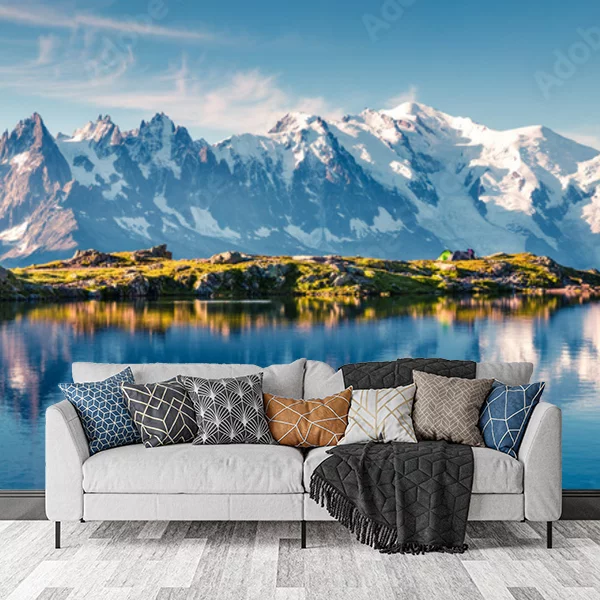 Fototapeta przedstawia malowniczy krajobraz górski z majestatycznymi szczytami odbijającymi się w spokojnej tafli jeziora. Błękitne niebo i delikatne chmury dodają głębi i świeżości, tworząc harmonijną i uspokajającą atmosferę. Zieleń traw na brzegach jeziora wprowadza żywy kontrast, podkreślając naturalne piękno sceny. Idealna propozycja do wnętrz, które potrzebują odrobiny natury i przestrzeni.
