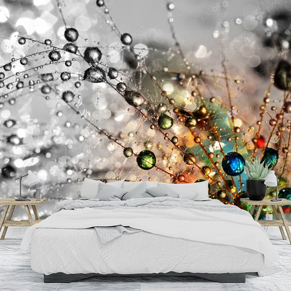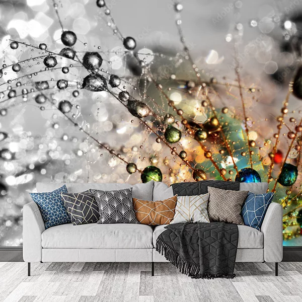 Na przedstawionym obrazie widać zbliżenie kropelek wody na delikatnych nasionach dmuchawca. Tło jest nieostre, co nadaje fotografii efekt głębi. Kropelki wody działają jak maleńkie soczewki, załamując światło i ukazując piękne odbicia oraz tęczowe refleksy. Kolory są intensywne i błyszczące, co kontrastuje z szarością i bielą rozmytego tła. Jest to dynamiczna kompozycja z dużą ilością detali, w której realizmie splata się z abstrakcją.