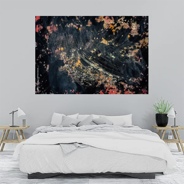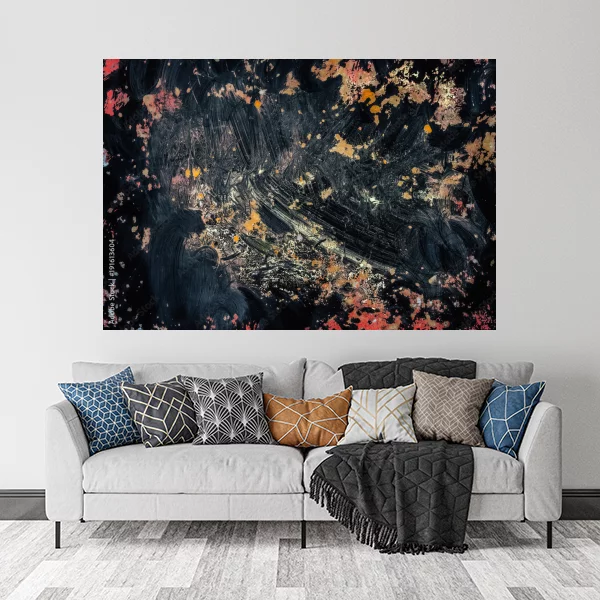 Obraz na płótnie przedstawia abstrakcyjną kompozycję. Dominują ciemne, głębokie kolory takie jak czarny i szary, z akcentami czerwieni, pomarańczu i złota. Farby są nakładane chaotycznie, tworząc dynamiczny i ekspresyjny efekt. Kompozycja jest pełna energii i ma surową, teksturową powierzchnię, co nadaje jej intrygujący charakter. Idealnie nadaje się na ścianę, dodając wnętrzu nowoczesności i tajemniczości.