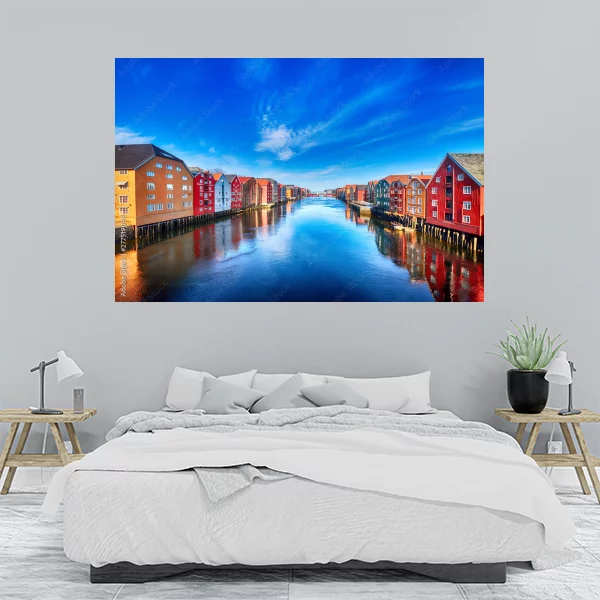 Obraz na płótnie przedstawia malowniczy widok kanału otoczonego przez kolorowe, drewniane domy. Budynki są pomalowane na różne, żywe kolory, takie jak czerwony, pomarańczowy, żółty i brązowy, co dodaje obrazu radosnego nastroju. Woda w kanale odbija niebo oraz fasady domów, tworząc spokojną atmosferę. Na niebie widać delikatne chmury i intensywny błękit, co sugeruje pogodny dzień. Taka kompozycja doskonale nadaje się do wnętrza, dodając przestrzeni energii i przytulności.