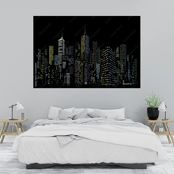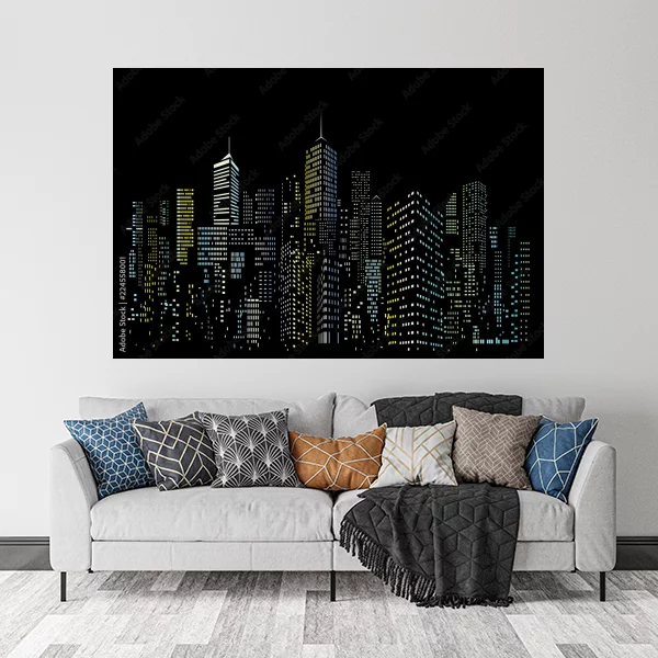 Ten obraz drukowany na płótnie przedstawia dynamiczną panoramę nocnego miasta, pełną migoczących świateł w wieżowcach tworzących imponującą miejską sylwetkę. Idealny do wnętrz, szczególnie do salonu czy sypialni, dodając nowoczesnego i kosmopolitycznego charakteru. Obraz dostępny na wymiar, co pozwala na spersonalizowanie go do każdej przestrzeni. Można go również zamówić na różnych materiałach, takich jak szkło plexi, płyta PCV, płótno bawełniane, poliestrowe czy na korku. Dodatkowo, eleganckie wykończenie w ramie drewnianej, dostępnej w kolorze czarnym lub naturalnym, podkreśla jego unikatowy styl. Obraz może być także wykonany na płycie Dibond, co zapewnia nowoczesny i trwały wygląd. Ta artystyczna dekoracja stanowi doskonałe połączenie estetyki z funkcjonalnością, idealne dla miłośników miejskiej atmosfery.