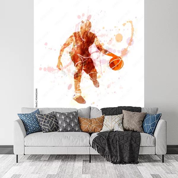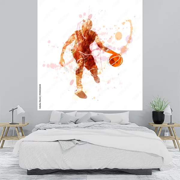 Obraz przedstawia dynamikę gry w koszykówkę w artystycznej formie akwareli. W centrum kompozycji znajduje się sylwetka koszykarza, który kozłuje piłkę. Postać koszykarza jest dynamiczna, uchwycona w ruchu, co dodaje całej kompozycji energii. Kolory są przede wszystkim ciepłe, dominują odcienie brązu i pomarańczy, co nadaje obrazowi żywej i ekspresyjnej charakterystyki. Tło jest abstrakcyjne, wypełnione plamami oraz rozpryskami farb, co potęguje wrażenie ruchu i dynamiki. Idealny na ozdobę ścian dla miłośników sportu, zarówno do pokoju młodzieżowego, jak i w salonie lub siłowni.