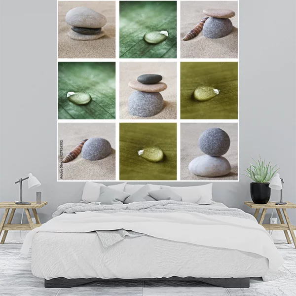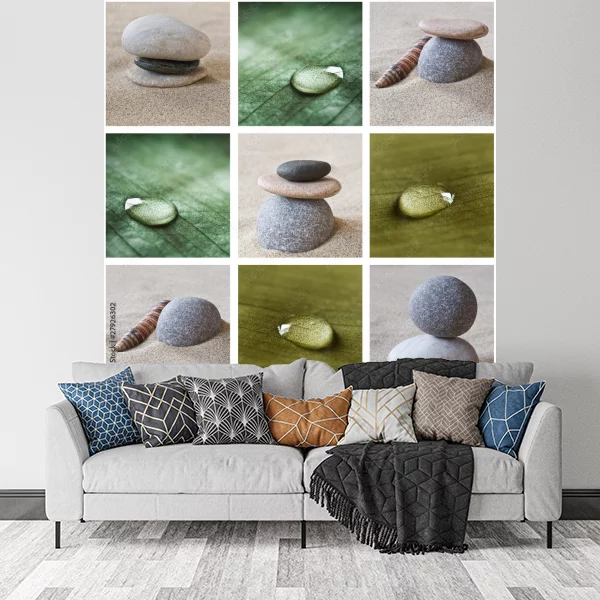 Obraz na płótnie składa się z dziewięciu mniejszych kwadratów, tworząc siatkę 3x3. Przedstawia kompozycje kamieni, kropli wody oraz fragmenty zielonego liścia. Górny rząd obrazu pokazuje zestawienia kamieni i kropli wody. Środkowy element środkowego rzędu prezentuje mały stos kamieni na piasku. Obrazy mają delikatną, stonowaną kolorystykę, dominują odcienie zieleni i beżu, co nadaje całości uspokajający, harmonijny charakter. To idealna dekoracja na ścianę, wprowadzająca element natury do wnętrza.