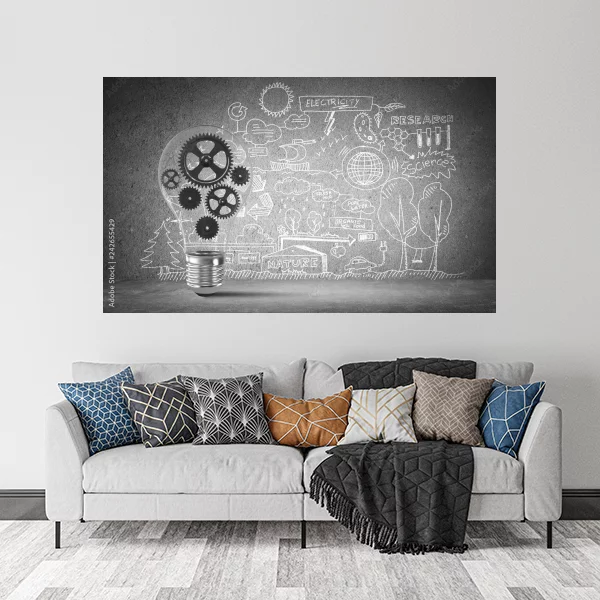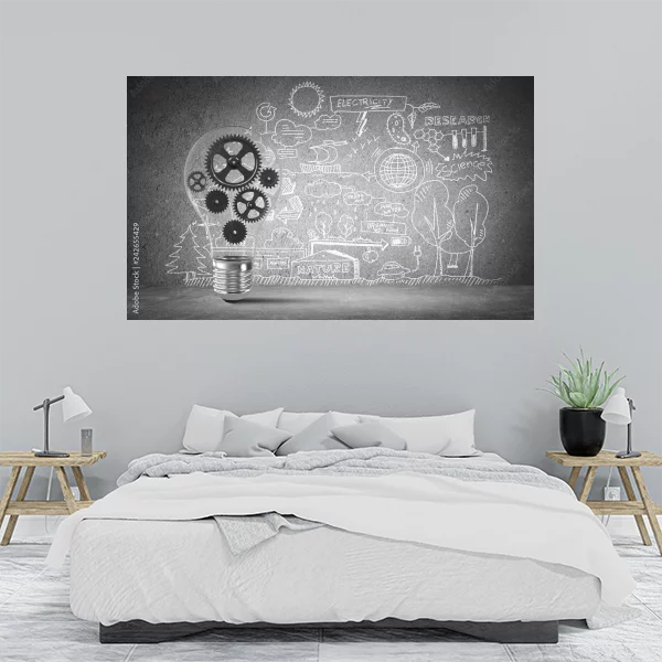 Obraz przedstawia żarówkę zębatą na mrocznym tle. Żarówka jest przezroczysta, a wewnątrz znajdują się czarne zębatki symbolizujące mechanizmy myślenia. Tło jest szare, udekorowane białą kredową grafiką, prezentującą różne symbole naukowe, takie jak diagramy, drzewa, chmury, i napisy związane z naturą, elektrycznością i nauką. Praca łączy w sobie elementy technologii i przyrody, co tworzy kreatywny, inspirujący klimat.